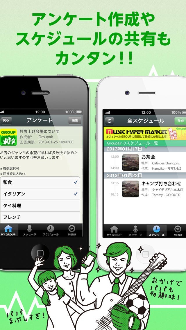 "Groupair"は、無料で利用できる新しい形のボイスコミュニケーションツールアプリです。目的にあったグループを作成し、メンバーを招待すれば、テキストや音声メッセージを容易に送信する事ができます。さらに、グループ内ツール機能として、掲示板やアンケート、スケジュールの管理機能など、充実した機能を搭載しています。このアプリの最大の特徴は、ボイスメッセージが送れる点にあります。これは、類似のチャットアプリには備わっていない機能で、上手く使いこなせば、大変有効な機能となっています。サークルやイベントなど、様々なグループ内でのコミュニケーションを、よりスムーズに臨場感あるボイスメッセージで行いたい方に最適なアプリです。