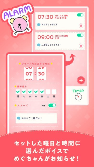 東雲めぐ公式アプリでは、曜日ごとの設定ができる目覚まし時計の機能だけでなく、タイマーの機能も用意されており、秒単位の設定が可能となっています。また、ボイスはバイノーラル録音のためイヤホンで聞くとより楽しめるものとなっています。