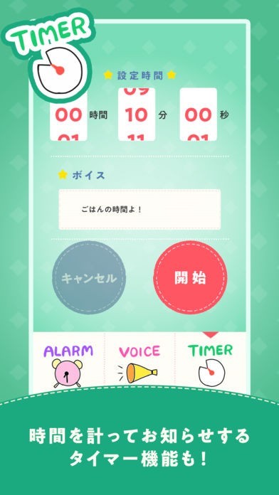 設定した時間を計測してボイスでお知らせしてくれるタイマー機能も利用することができます。料理や勉強、スポーツなど様々な場面で利用可能で、東雲めぐのボイスで作業のヤル気アップを図りましょう。