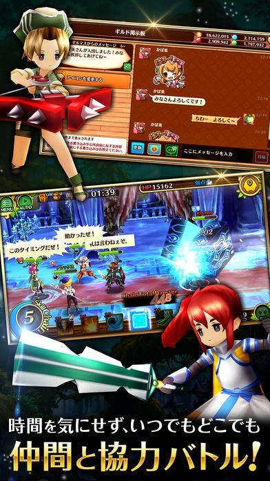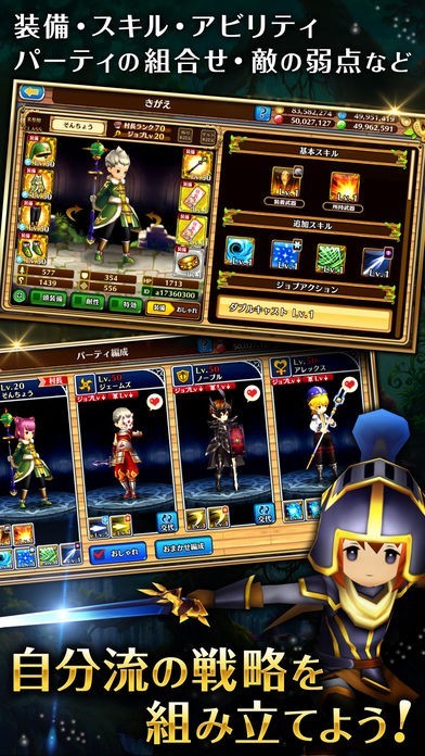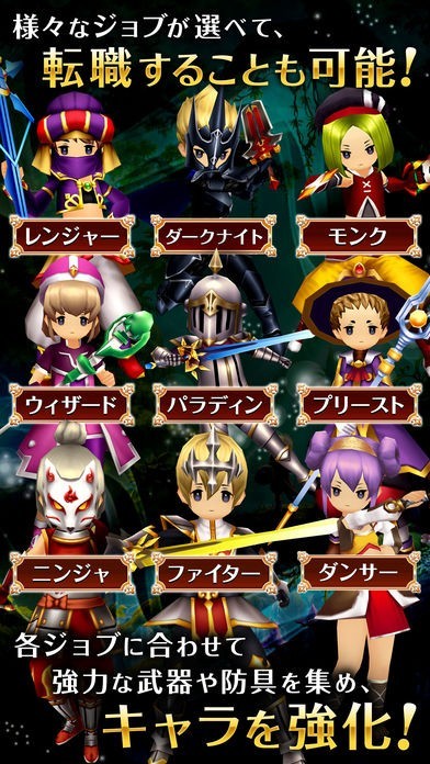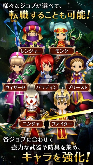 たくさんのプレイヤーとともに、ファンタジーの世界を冒険するアプリです。様々な装備やジョブを整えて、プレイヤー達とパーティを組み、広い世界へ旅に出るRPGです。敵の弱点を考慮してジョブチェンジしたり、アビリティや仲間の組み合わせを決めて、自分だけの戦略を立てることができるでしょう。数多くのダンジョンを攻略したり、敵とのバトルだけでなく、手に入れた資材によって村を発展させることで、冒険に有利な機能を手に入れることも可能です。