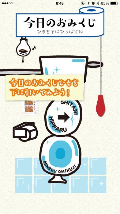 今日のおみくじ画面へ進み、ひもを引っ張るとキャラクターが降ってくる。
