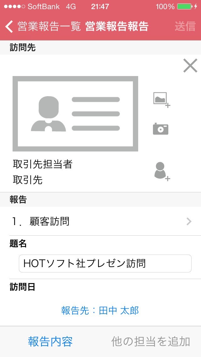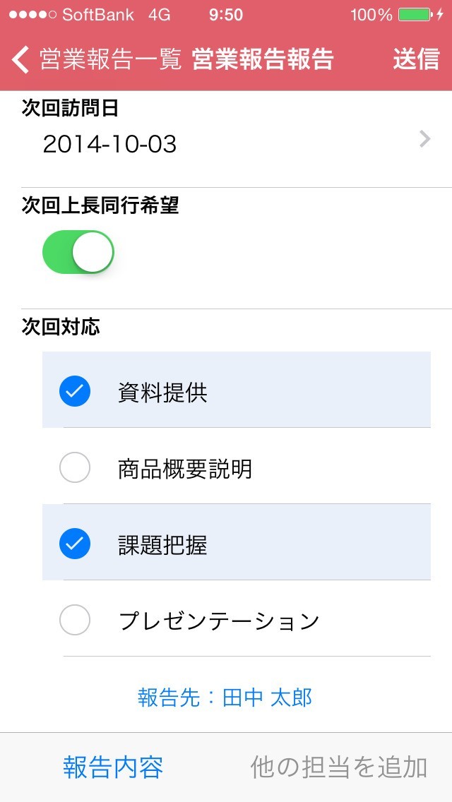 便利なリアルタイム報告機能搭載。次回に必要な項目もタップだけで報告完了!