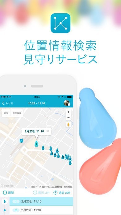 見守りたい人に小型の端末を持って出かけてもらうだけで、アプリから位置情報を知ることができます。定点に設置されているレシーバーや、同じようにキンセイを使っている人とすれ違うだけで現在地が分かります。
