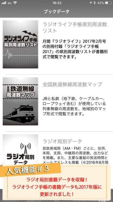 このアプリでは、全国のラジオ局に関する情報が載っている「ラジオ局別データ」や、JRや私鉄が使っている鉄道無線の周波数が分かる、「全国鉄道無線周波数マップ」などの書籍を読むこともできるので、アプリ上で情報を収集することができます。