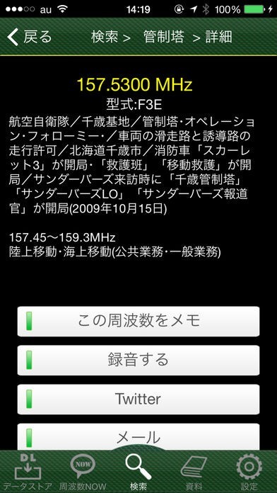 周波数帳2014年度版では、周波数情報を閲覧している際にもアプリの機能で録音が可能となっており、気になる情報を手軽に録音することができます。また、Twitterで周波数の情報を共有もできます。