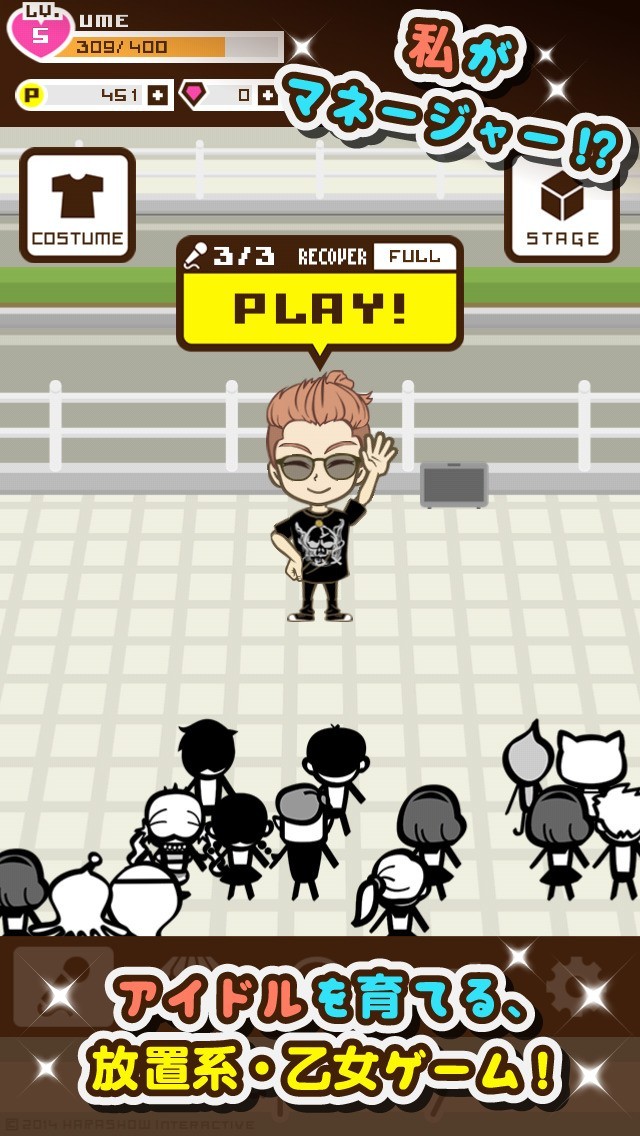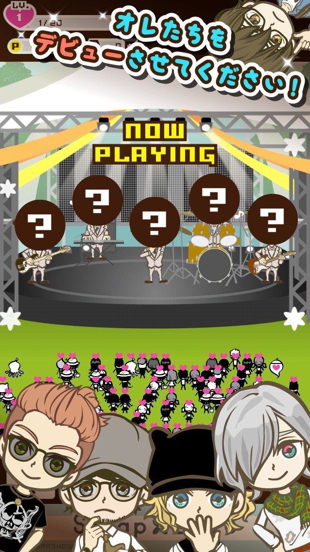 ライブに集まってくるお客さんの「ハート」を集めて、キャラクターを成長させる、シンプルな放置系・乙女ゲームです。