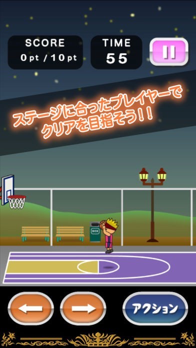 2Dグラフィックで描かれたキャラクターを左右ボタンとタップで操作してバスケットのシュートを決める無料アクションゲームです。子どもも楽しめる簡単操作と幅広い難易度で暇つぶしにもってこいです。