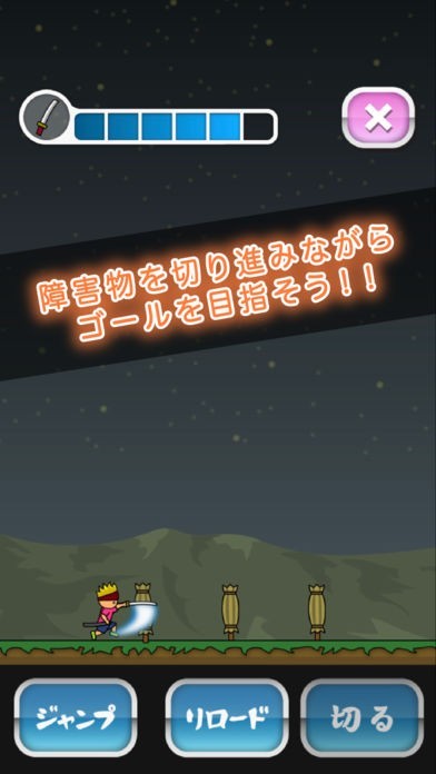 主人公の手にする刀で、進路上に現れる障害物を切りながら進むゲームです。最初から最後まで一本の刀で進むのではなく、ゲーム中に刀を交換できます。背景は雰囲気のある夜の山脈です。
