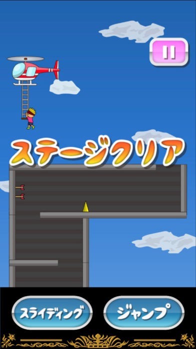 操作は簡単でスライディングボタンとジャンプをタイミングよくタップするだけ。壁に向かってジャンプすれば三角とびすることが出来ます。ヘリコプターにジャンプしてステージクリアを目指しましょう。