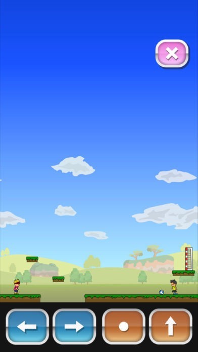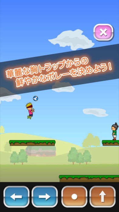 操作に使うボタンは全部で4つだけです。左右の矢印で主人公を動かし、上矢印でジャンプします。タイミング良く丸ボタンをタップするとボレーシュートを打ちます。何度も練習をしてタイミングを合わせてください。