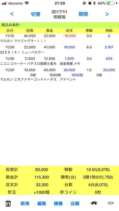 稼動時間や換金等の集計項目が多彩に用意されているので、パチンコで得た収支を細かく分析したい時に重宝するでしょう。機種や店舗名でデータを検索出来るのも特徴ですね。