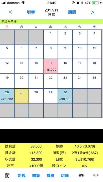 使ったお金や稼いだお金はもちちろん、パチンコをしていた時間や日数の記録ができます。収入をリアルな数字で表示してくれますし、時給や日当にも換算できる。日にちや月ごとにどのくらいの収入があったのか、グラフやカレンダーで表示できます。