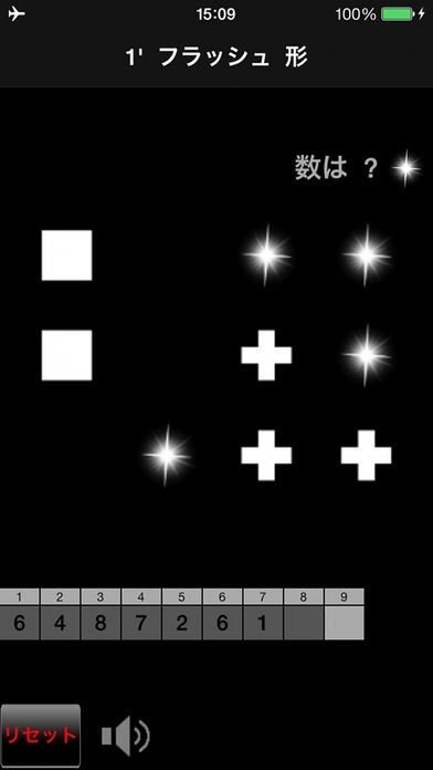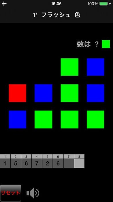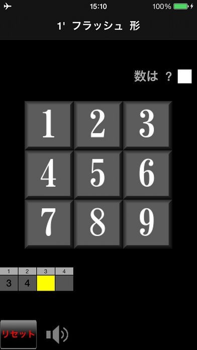 次々に表示される図形を覚えていくゲームで、1回前や2回前に表示された指定の色や形の図形の数を解答します。解答は1から9までの数字をタップするだけなので簡単です。」