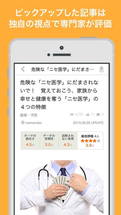 病気・医療や健康・予防など9種類のカテゴリーに関する最新ニュースを専門家が分かりやすく解説してくれます。ただ自分でニュースを読むだけでなく、公衆衛生学の専門家のコメントが読めるのでニュースの理解がより深まります。他のユーザーのニュースへのコメントも載っているので、他の人の意見も参考にすることができます。専門家やカテゴリーをフォローすることもできるので、自分向けのニュースだけを集めて日々の健康に生かすことも可能です。理解が難しいニュースでも様々な人のニュースに対するコメントを見ることで、疑わしい情報が氾濫する中で正しい情報を取捨選択することができます。
