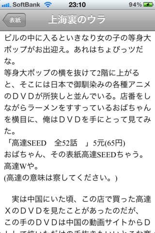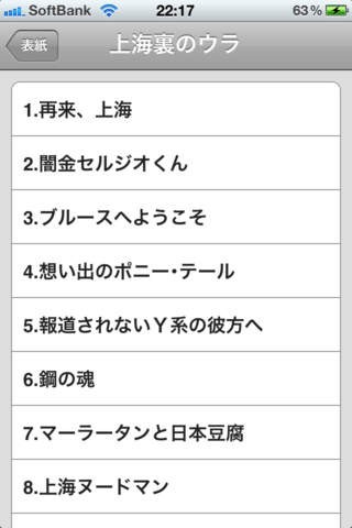 日本人の作者と中国人の彼女との恋愛事情を描いたストーリーから目が離せなくなる上海の裏話はアプリで読むことができます。メイン画面は非常にシンプルでタイトルと目次から構成されています。目次ボタンをタップすれば任意の部分からスタートすることができるので前に読んだ部分の続きから読みたいというときに便利な機能です。また、読み終わった時にはタイトル画面に戻ることで間違ってページを送ってしまうことを防げます。独特の語り口が魅力の一つです。