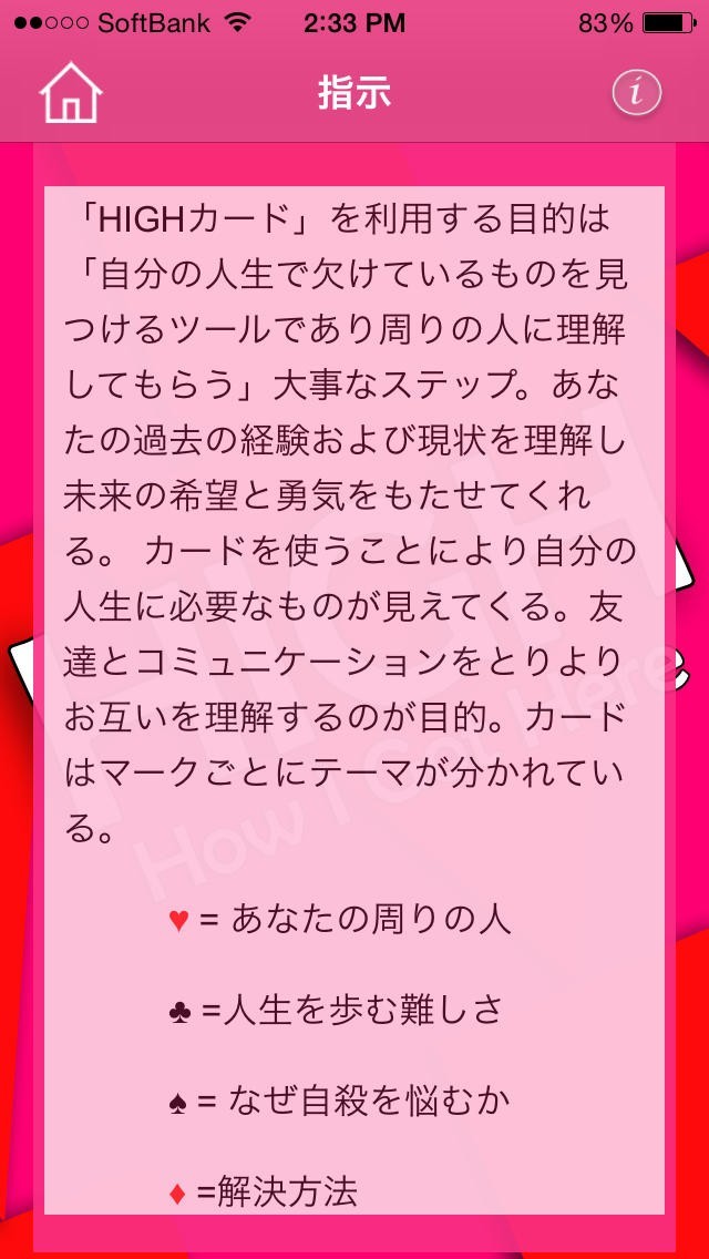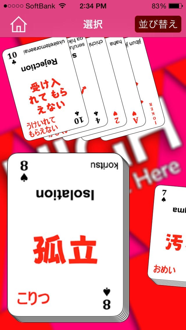 悩み事を抱えていてもうまく自分の言葉で表現することができなかったり、だれに相談してよいかがわからなくて悩んでいる方にピッタリのアプリが「HIGH Cards」です。このアプリはトランプのカードを選択することによって自分の悩みや解決方法を言葉にすることができます。それぞれの記号に意味があり、悩みを解決するためのシステムがわかりやすくなっています。きちんと言葉にすることによって自分自身でも自分の気持ちを理解することができるようになるでしょう。