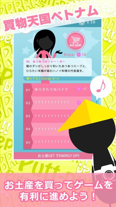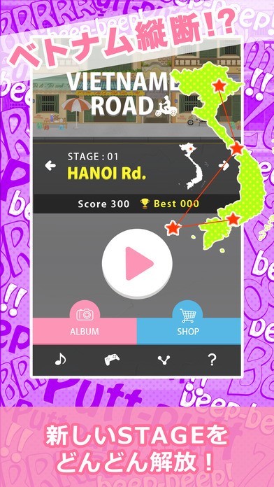 「Vietnamese Road」は、ベトナムを舞台にした縦スクロールアクションゲームです。バイクや車が激しく行き交うベトナムの横断歩道を渡っていきましょう。画面下部に設定されたコントローラの操作がクリアへのポイント。乗り物に衝突しないように調整しつつ、タイミングを捉えて上から下へと道路を駆け抜けます。道路に落ちているハスの花びらを集めれば、ショップでお土産の購入も可能。また、乗り物をタップすれば撮影が行えるなど、やり込み要素も充実しています。手軽に遊べるゲームとして移動中や待ち時間にもプレイできる他、やり込み要素に挑戦すれば長時間でも飽きずに遊べるようになっています。