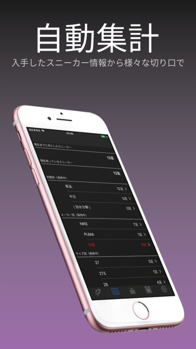登録しているスニーカーのデータは、メーカー別や生産時期別、サイズ別や新品中古別など様々な項目ごとにそれぞれの足数を自動で算出してくれる自動集計機能が搭載されています。