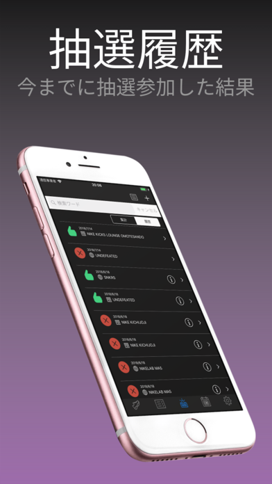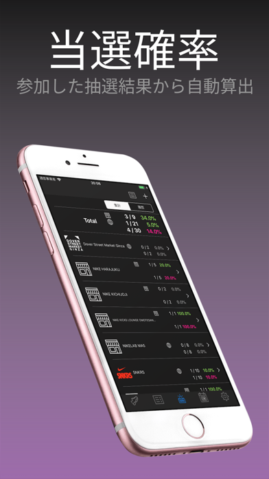 過去に参加したスニーカー抽選の抽選結果を履歴からチェックすることができます。また、そのデータから抽選確率も自動で弾き出してくれる機能が搭載されており、全体の確率だけでなくメーカー別の抽選確率も細かくチェックすることができるようになっています。