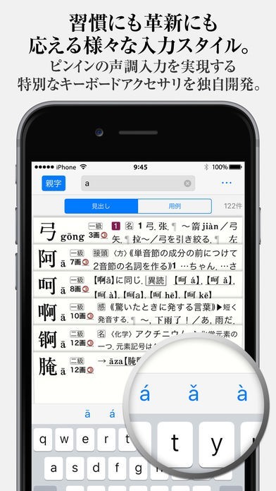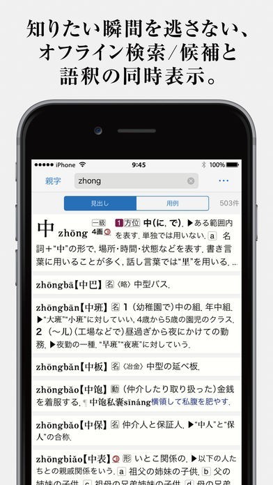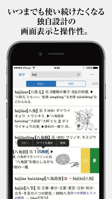 ピンインでの検索や手書き入力での検索など検索方法が多彩なので、スムーズに調べたい言葉を探し出せます。親字優先モードもあるので、親字から素早く熟語を表示できます。