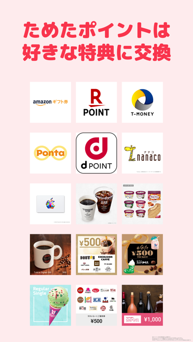・貯めたコインは、様々な他社ポイント・デジタルギフト・電子マネーなどと交換することができます。(Amazonギフト券、楽天ポイント、Tマネー、dポイント、Pontaポイント、nanacoポイント)