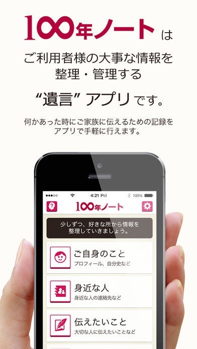 主に中高年世代を対象とした、法的な遺言とは別に気軽に伝えたい、遺したい情報を記録、保管したり、もしくは遺言を作る準備作業として自分に関する情報を整理したりすることができる「100年ノート」。このアプリでは、文字情報だけでなく、写真や音声データの記録も可能です。記録した情報は、事前に閲覧権利者として設定した人であれば、ユーザー本人がいなくても閲覧できますが、閲覧権利者を設定しなければ単純に大事な情報を記録しておくためのアプリとしても使えます。入力する情報は、ユーザー自身に関することや身近な人の連絡先、銀行口座や財産について、遺言や自分が亡くなった後に家族などに伝えたいメッセージなど、様々なカテゴリが用意されているので、整理しやすく後から閲覧する際にも必要なものが探しやすくなっています。
