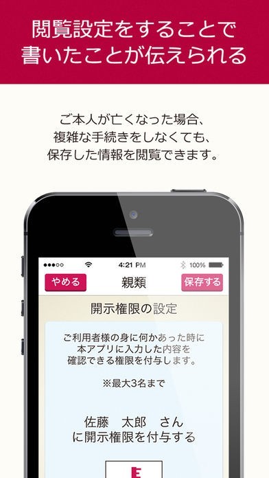 万が一の場合に役立つ遺言機能を搭載。閲覧設置機能で閲覧権限の設定も可能!