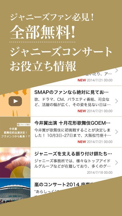 ジャニーズ事務所所属グループ・所属タレントの熱いファンに向けた「ジャニーズ通信」のアプリ版です。嵐、関ジャニ∞、Kis-My-Ft2など人気グループの最新コンサート情報や演劇出演情報などを毎日お届けします。無料で利用でき、ファンクラブ先行チケット情報や公演日程の他、コンサート用手作りうちわの作り方やコンサートマナー、コンサートに着て行く服の情報までファンが知りたい情報が満載です。コンサート中にタレントが話したMCの内容や、セットリスト情報などファン必見です。