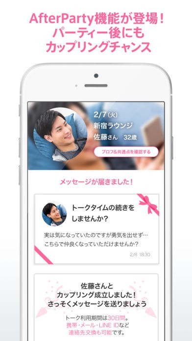 婚活パーティに行くと気になる人がたくさんいます。その中から1人を選ぶのはなかなか困難です。そんな時にこのアプリを使用すればパーティが終わった後でも気になった人にメッセージでやり取りすることが出来ます。