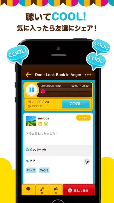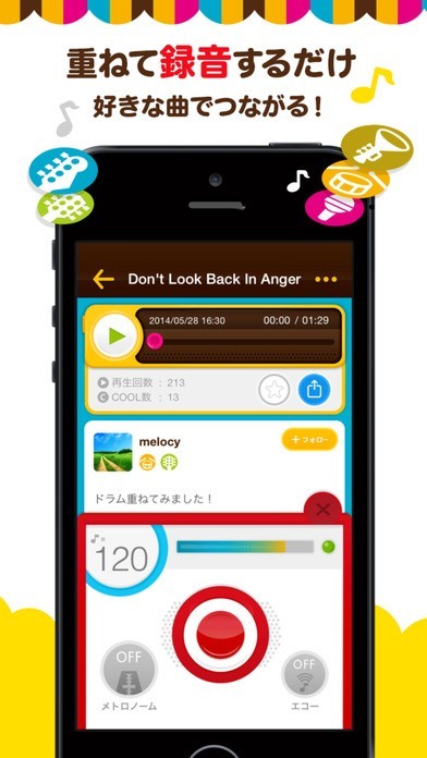 遠く離れている日本全国のユーザーとバンドを結成することが出来る録音アプリが「melocy(メロシー)」です。アプリの録音ボタンをタップして演奏したり、歌ったりすることで自動的にトラックが作成されて、他のユーザーとシェアすることが出来るようになっていて、作成したトラックにさらにほかのユーザーの演奏や歌声を重ねていくことが出来るので、遠く離れたところにいる人ともアプリを通してバンドを結成して楽曲を作成することが出来るようになっています。他のユーザーが投稿した曲を聴くこともできるようになっていて、友達とシェアしたりcoolボタンで評価したりすることが可能です。