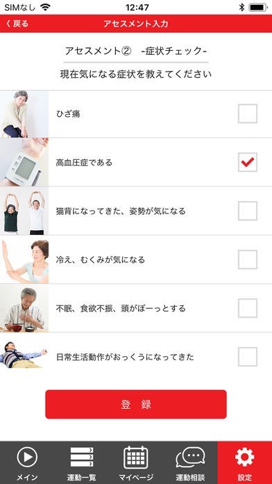 ・ 「症状」チェックに高血圧、姿勢、冷え、むくみ、不眠、等の9項目を追加し、さらに最適な運動プログラムをレコメンド