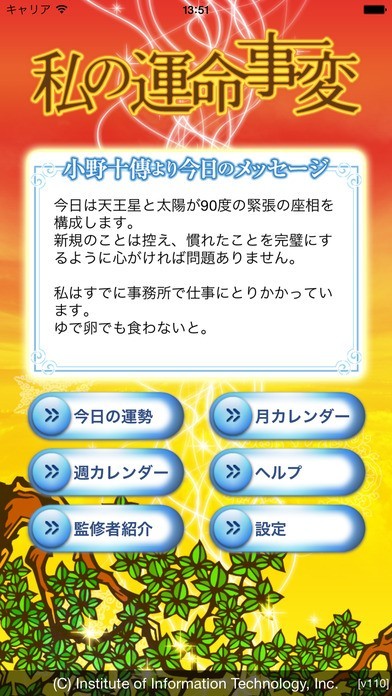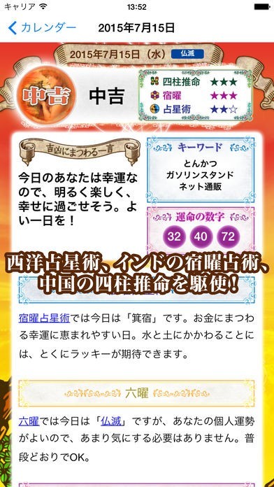 西洋占星術、インドの宿曜占術、中国の四柱推命などを世界中の占術を駆使して、あなたの誕生日を基に二万通りのデータの中から『あなただけの運勢』を毎日占ってくれます。