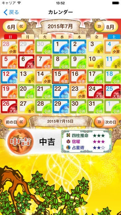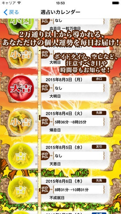 スマホのスケジュールと瞬時に同期するので、『大事な会議の日の運勢』や『誕生日の運勢』などピンポイントで占うことができ、逆に運勢のいい日にスケジュールを入れることもできます。