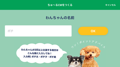スマートフォンで誰でも簡単にCMが作れちゃうアプリがついに登場です。操作は簡単。ワンちゃんの名前とお住まいの都道府県を入力して、映像を3カット撮影するだけ。これだけであなただけのCMが簡単に作れちゃいます。
