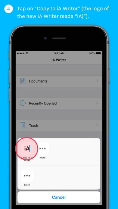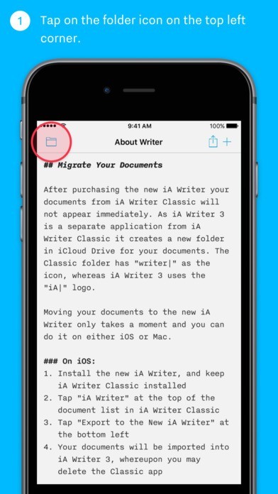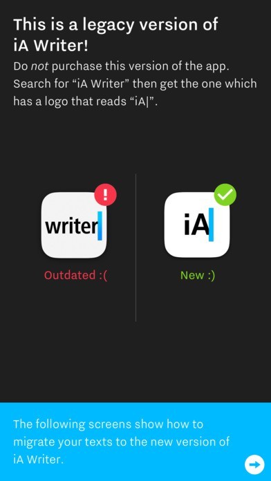 This update is for customers who previously purchased iA Writer Classic, which was removed from sale last year. New customers should purchase the new iA Writer with the “iA|” icon instead of this version. To migrate documents from iA Writer Classic to the new iA Writer, follow the directions in the screenshots.