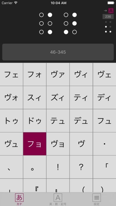 五十音すべての文字の点字での打点方法だけでなく、拗音、促音までカバーしています。そのため外来語を日本語点字で打つ場合も可能で、不自然にならない小文字を含めた文を作れます。