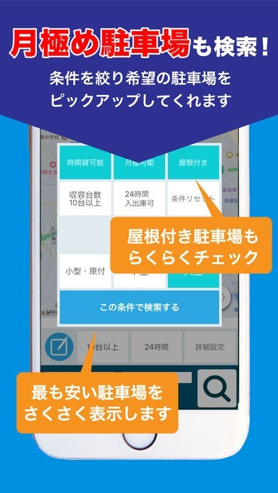 入庫する時間と駐車する時間を入力すると自動で駐車料金をシミュレーションしてくれて、安い順番で検索結果が表示されるので、安い駐車場を簡単に見つけることができます。