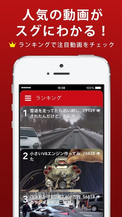 このアプリを使えば車の動画をたくさん見ることが出来るようになります。 例えば、「ドライブレコーダー」による衝撃的な事故動画などもあれば、「最新の車」を見ることもできますし、「自動運転」の車などといったいろいろな種類のものを視聴することが出来るようにしてくれます。 よって、ちょっとした空き時間に楽しむといったこともできます。 また、ランキングによって、多くの人が見ているものをチェックするといったこともできますし、カードをめくるような操作でどんどんと新たなものを視聴することが出来るという操作面での魅力もあります。