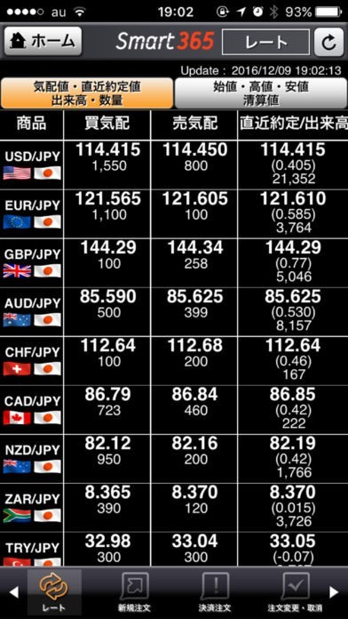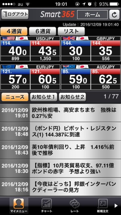 リアルタイム為替レートを4通貨ペア、6通貨ペア、リスト表示から見やすいものを選べる