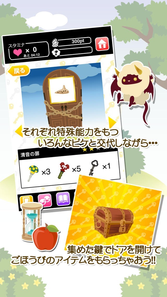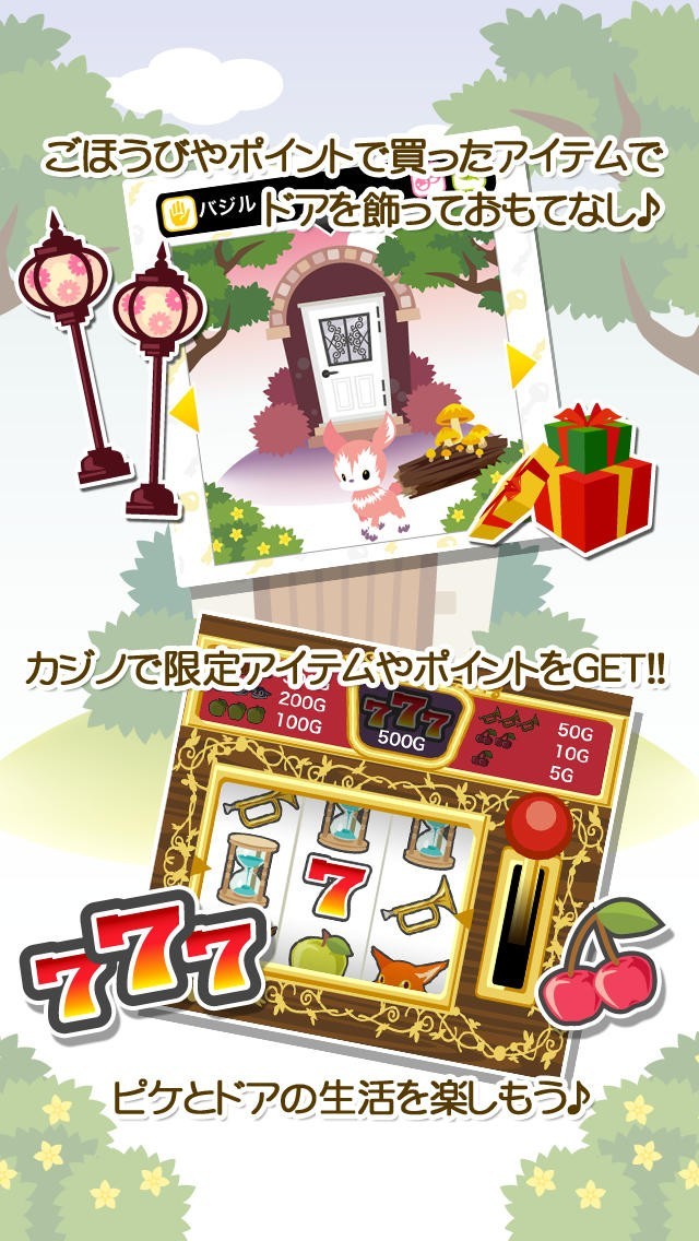 "ピケとドア"は、ドアの妖精"ピケ"と新しいドアを開いてアイテムやコインを集めていく、絵本のような可愛い世界感が魅力のカジュアルゲームとなっています。ピケのくれる鍵がゲームの重要なポイントとなっており、この鍵で新しいドアをたくさん開いて行きます。その為、より多くのピケと出会う必要があるのですが、友達のピケと交流したり、15文字のメッセージを送ることで、ユーザー同士がコミュニケーションをとる事ができ、こうして友達からピケをいじってもらったり、新たなピケと出会うことが可能となっています。また、出会ったピケは図鑑に収録され、コレクションとして楽しめるのも魅力の仕様です。他にもミニゲームのカジノではスロットが楽しめるなど、遊びごたえ満載のアプリです。