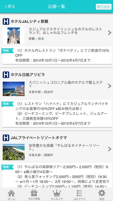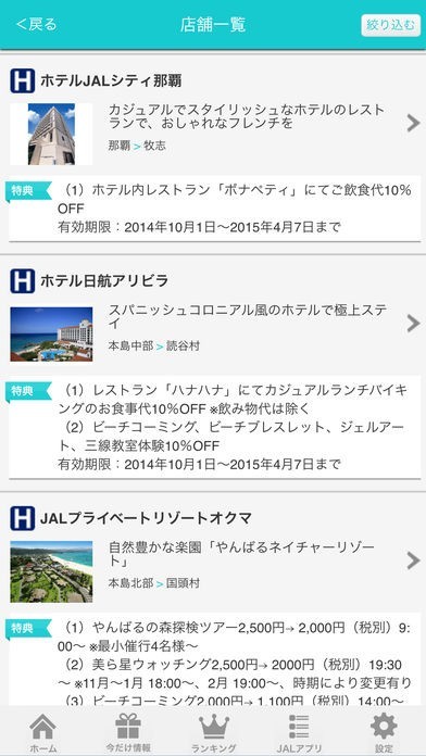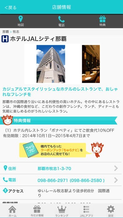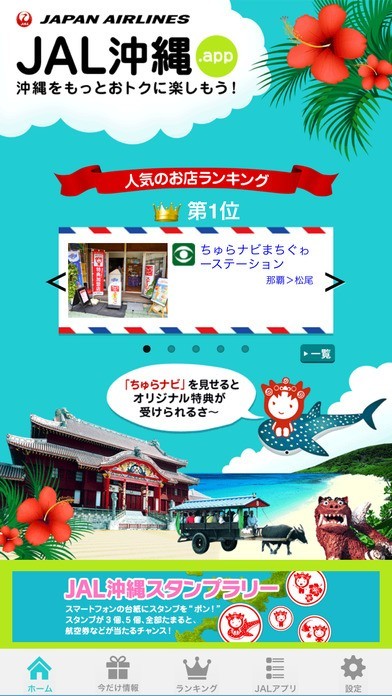 オリジナル特典持ち歩きブック「JAL ぴあ 「ちゅらナビ」のサポートアプリです。厳選した200以上の店舗でご利用いただけるおトクな特典が掲載されています。