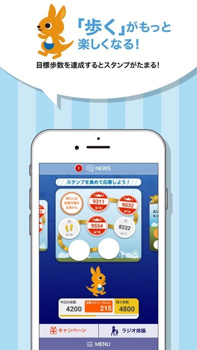 歩数計機能が搭載されているため、スマホを持って歩くだけで歩数をカウントしてくれます。設定されている目標歩数に到達すると、1日1個スタンプをゲットすることができます。