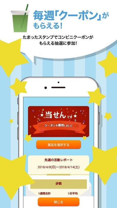 毎日歩いてもらったスタンプを使用して、毎週行われているクーポン抽選にチャレンジすることができます。貯まっているスタンプが多ければ多いほど抽選に当選する確率が上がるシステムになっています。