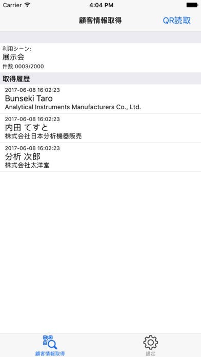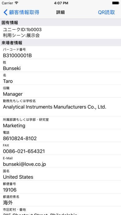 来場者の入場証のQRコードを読み取って、顧客の情報を取得し、追加情報を保存できます。