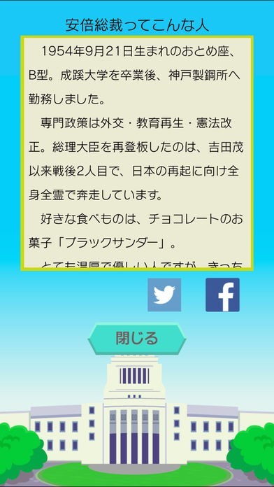 あべぴょんは、総理大臣のキャラクターで、総理大臣のことや政治についてのコラムを読みながらゲームを進めていく