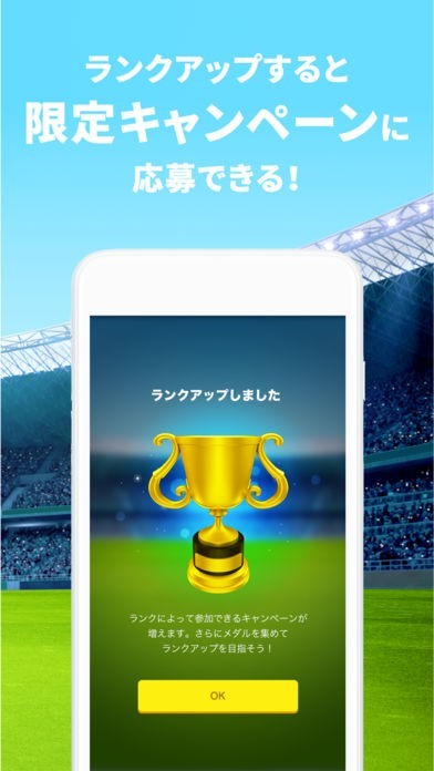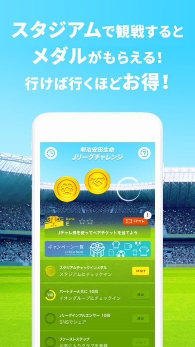 試合の開催日にはスタジアムまで足を運び、チェックインすることで観戦メダルを獲得できるようになっています。観戦メダルを獲得することでランクアップ可能。楽しみながらメダル集めを行えます。
