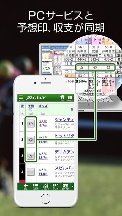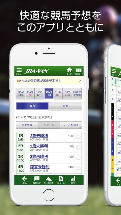 「JRA-VAN競馬情報」は、JRAが提供している公式のデータを携帯デバイス上で利用できるアプリです。有料サービスが基本ですが、競馬が好きな人にはうってつけのサービスです。リアルタイムの競馬ニュースだけではなく、レース動画やパドック動画、調教動画を視聴することが可能です。JRAが公式に提供しているデータを利用すれば、人工知能を利用したデータマイニング予想を使うこともできます。また、自分が気に入った競走馬を600頭まで登録することもできるため、追いかけている競走馬がどのレースで出走するのかもすぐにわかります。投票も同じアプリ上で可能なので、非常に効率的に競馬予想を楽しめるようになります。