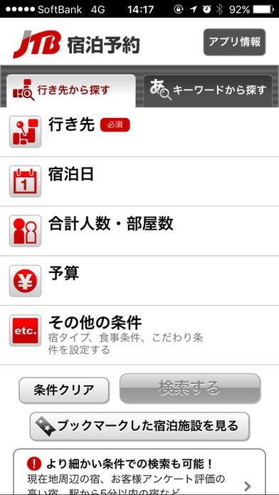 携帯アプリで細かな条件を入れると、自動で該当の宿泊先を一覧表示してくれて選びやすい