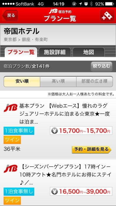 国内の大手旅行代理店として有名なJTBやるるぶジャパンのすすめるホテルや旅館を検索し、閲覧の上予約することもできる便利なアプリです。ホテルや旅館のサービスや部屋の広さ、アメニティについて等の詳細や地図まで掲載されているので、宿泊先をよく知った上で予約できるので安心です。