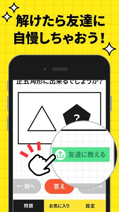 答えを導き出した問題は友達に共有して教えてあげることができます。誰よりも先に答えを導き出して他の人と差をつけましょう。みんなで回答の早さを競い合うのも楽しみ方の一つです。